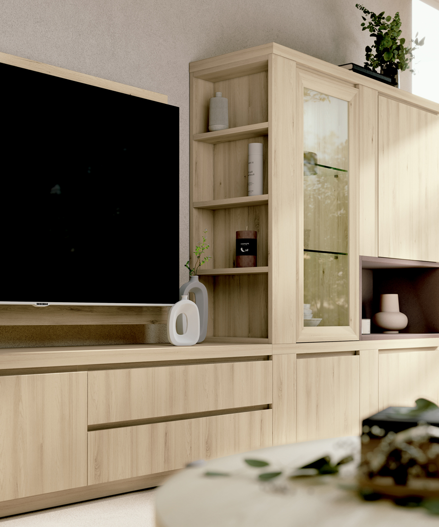 Mueble para salón de 315 cm en color Aura y detalles en Onix, también se fabrica a 285 y 300 cm. Práctico y Elegante: Las molduras de madera y perfiles de metal añaden personalidad a cada pieza. Otros colores disponibles según carta adjunta