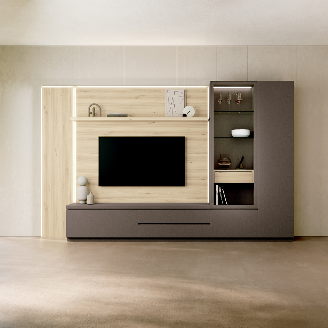Mueble para salón en color Blanco Seda y Samoa de 330 cm disponible también a 270 y 285 cm. Mueble con panel y luces de LED. Cajones internos dentro de vitrinas para mantener todo en orden