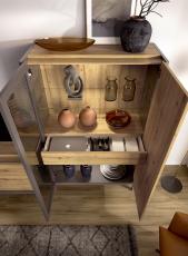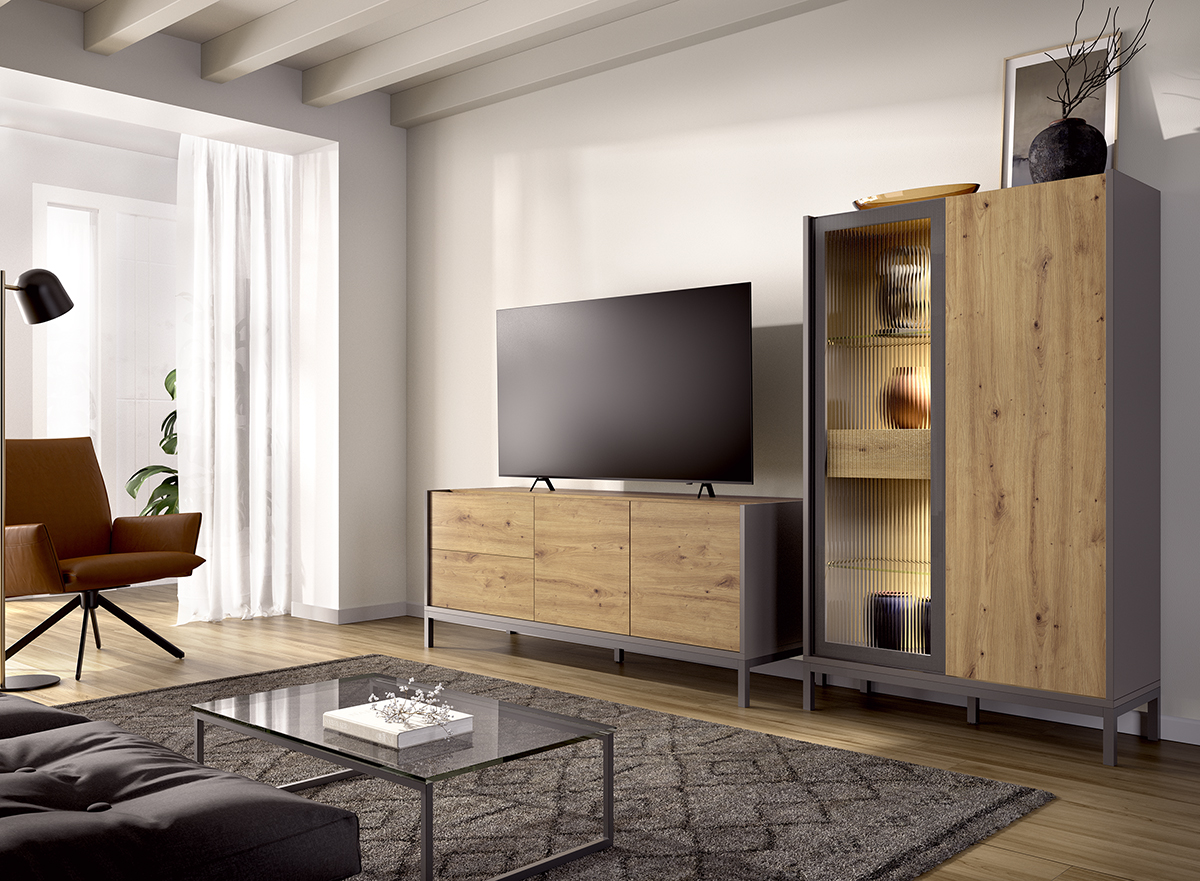 Comedor moderno de 22 cm en color Nordic y Grafito. Compuesto por bajo 2 cajones + 2 puertas de 150 con plataforma metálica y módulo singular 1 puerta + 1 vitrina de 82 con plataforma. Otras medidas y colores consultar en tienda