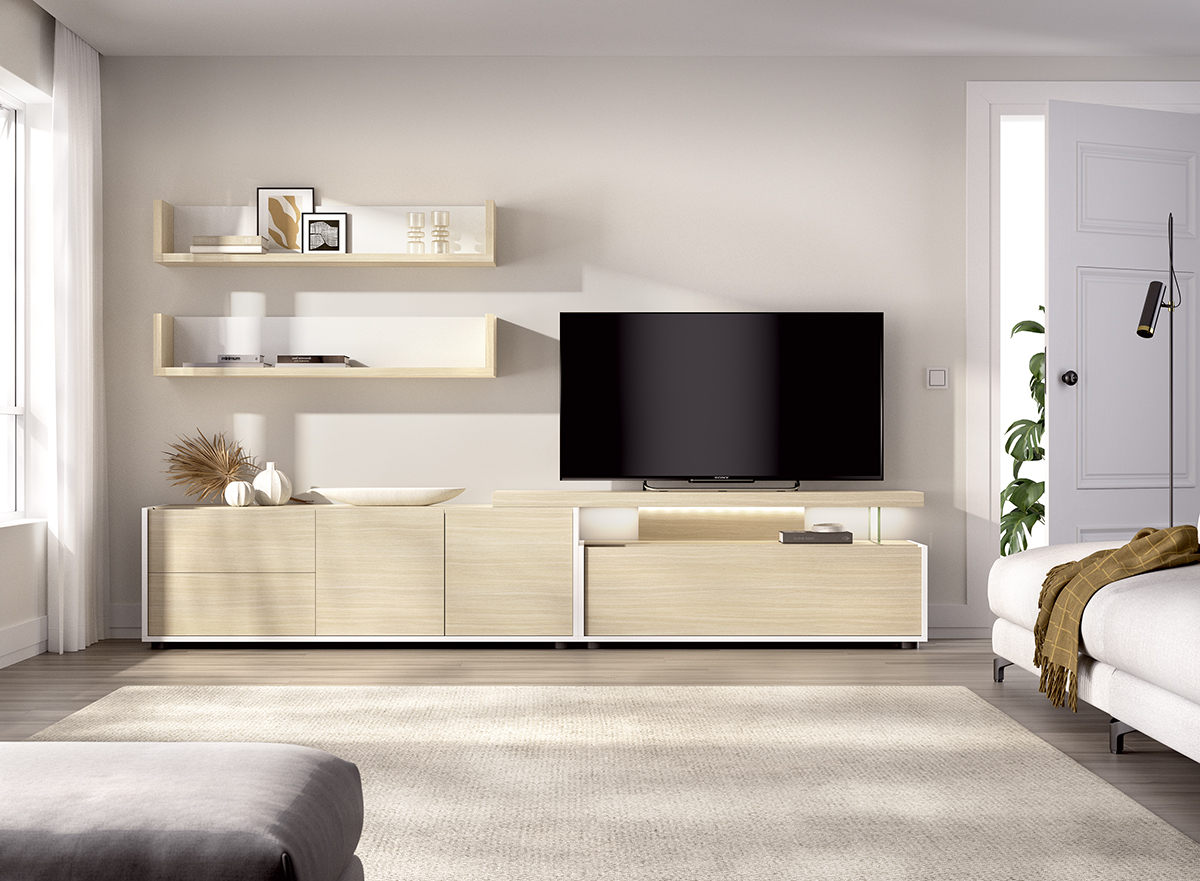 Comedor moderno de 270 cm formado por bajo 1 puerta abatible de 120 con pata regulable, bajo 2 cajones + 2 puertas de 150 con pata regulable, soporte Tv de 15 derecha y 2 estanterías de 120. Opcional: iluminación soporte TV. Otras medidas y colores consultar en teinda