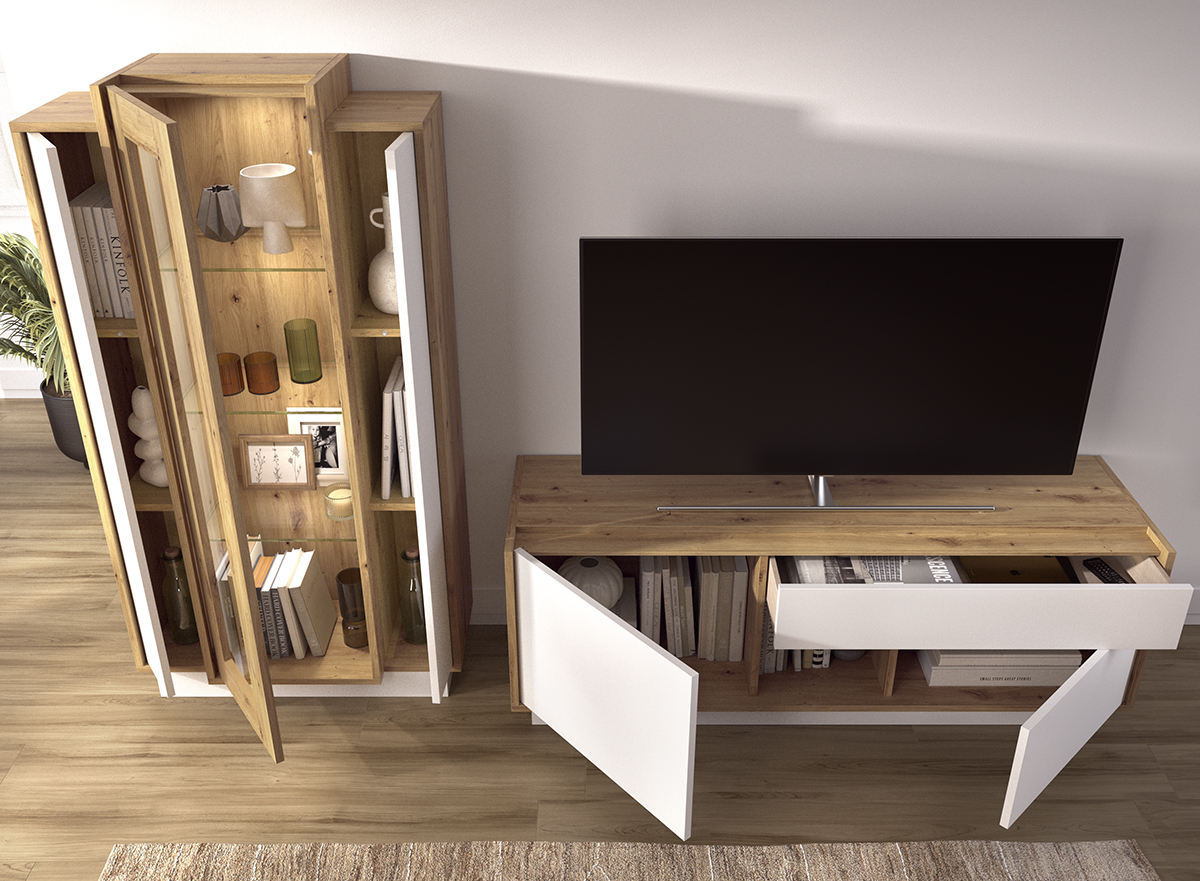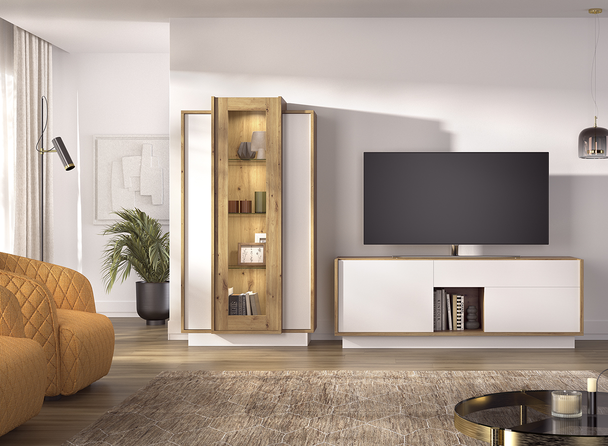 Comedor moderno de 232 cm formado por Bajo 1 cajón + 2 puertas + hueco de 150 con zócalo y módulo singular 3 puertas + vitrina marco madera de 82 con zócalo. Opcional kit iluminación 1 foco led. Otras medidas y colores consultar en tienda