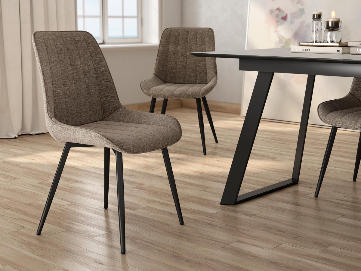 Silla con respaldo y asiento tapizado. Patas metálicas negras. Sillas tapizadas en tela Ufo colores crema, perla y marengo y en tela Brego en colores marrón, salmón, mostaza, verde, azul y gris. Se sirven en cajas de 2 unidades.