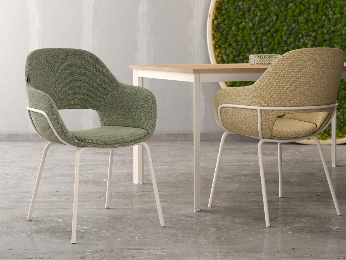 Silla con respaldo y asiento tapizado. Patas metálicas en color marfil. Silla tapizada en tela Lukka en colores nácar, mostaza, verde, marrón, salmón y gris. Se sirven en cajas de 1 unidad.