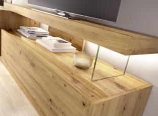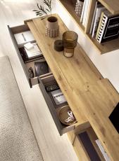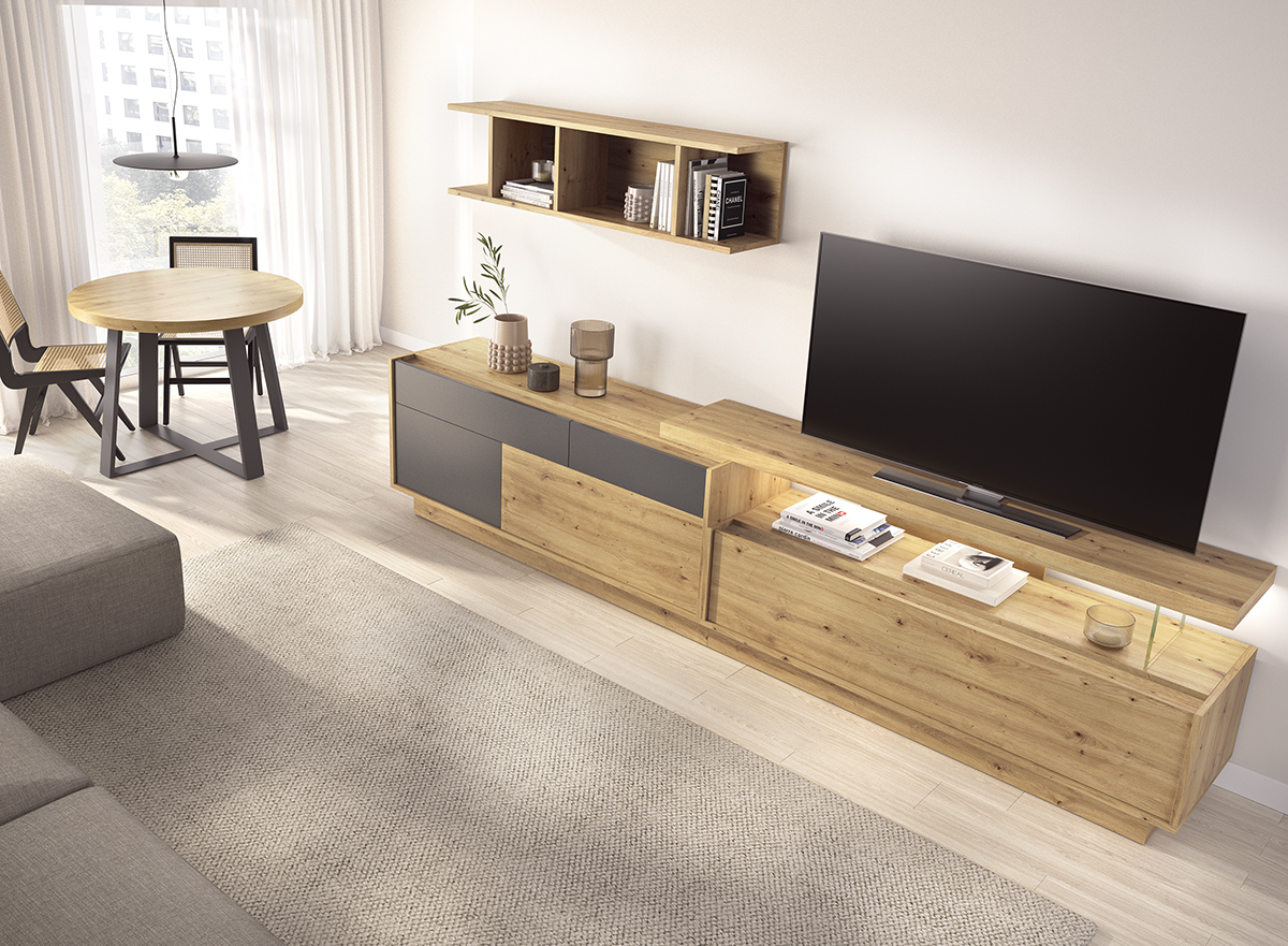 Comedor Moderno en color nordic y grafito de 300 cm compuesto por bajo 1 puerta abatible de 150 (f45) con zócalo, bajo 2 cajones + puerta abatible + puerta de 150 (f45) con zócalo, soporte tv de 178 y estantería de 120. Opcional: iluminación soporte Tv. Otros colores disponibles
