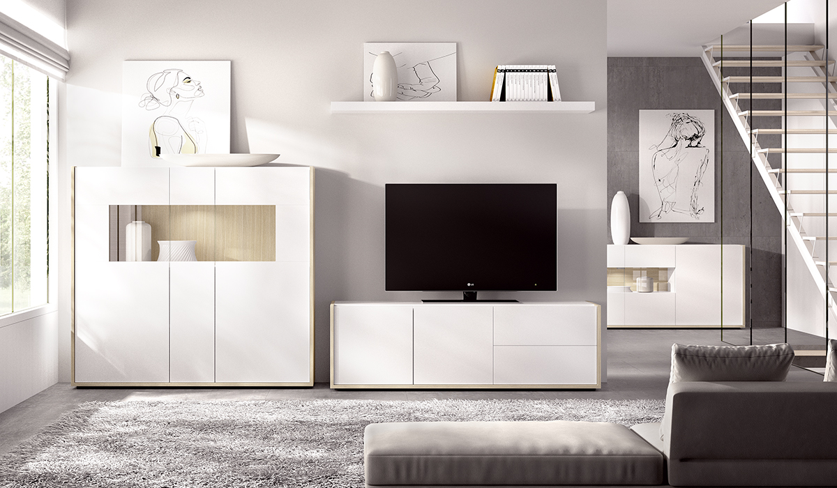 Comedor moderno de 285 cm en color blanco y roble compuesto por bajo 2 cajones + 2 puertas de 150 (f45), módulo singular 3 puertas cristal de 136 (f35) y estante pared 50 mm de 150 cm. Opcional kit 1 foco led. Otros colores disponibles.