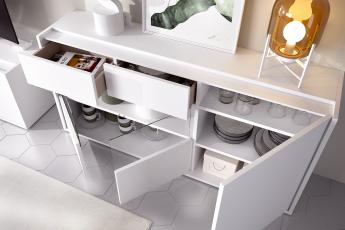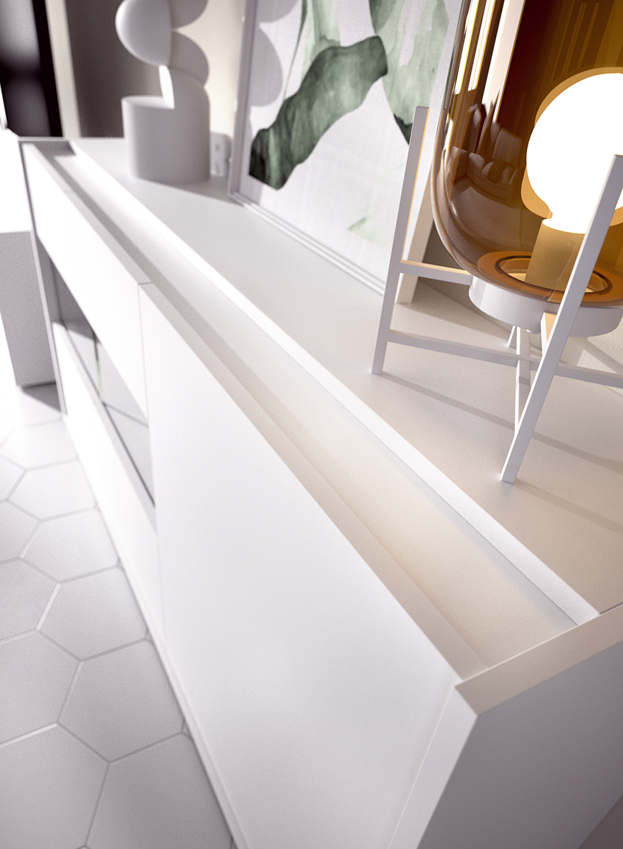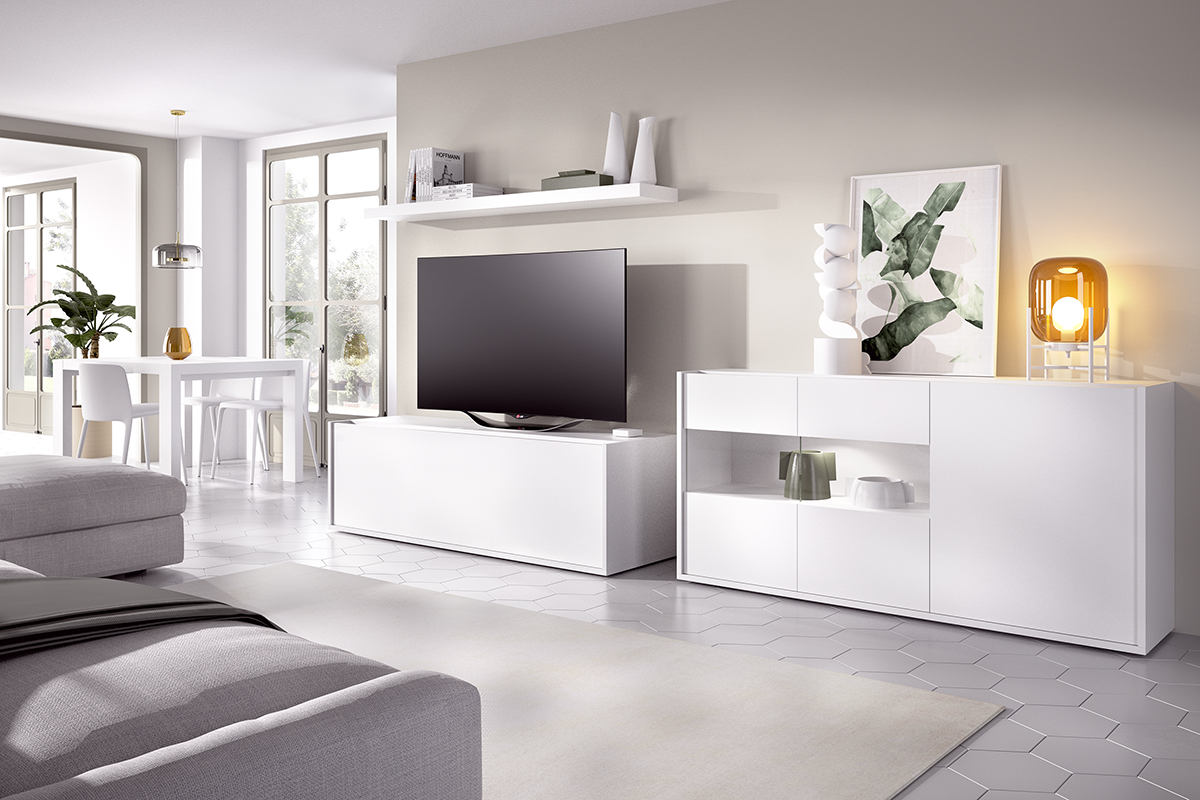 Comedor Moderno de 300 cm compuesto por bajo 1 puerta abatible de 150 (f45), aparador 2 cajones + 3 puertas de 150 (f45) y estante pared 50 mm de 150 cm. Opcional kit 1 foco led. Otros colores disponibles