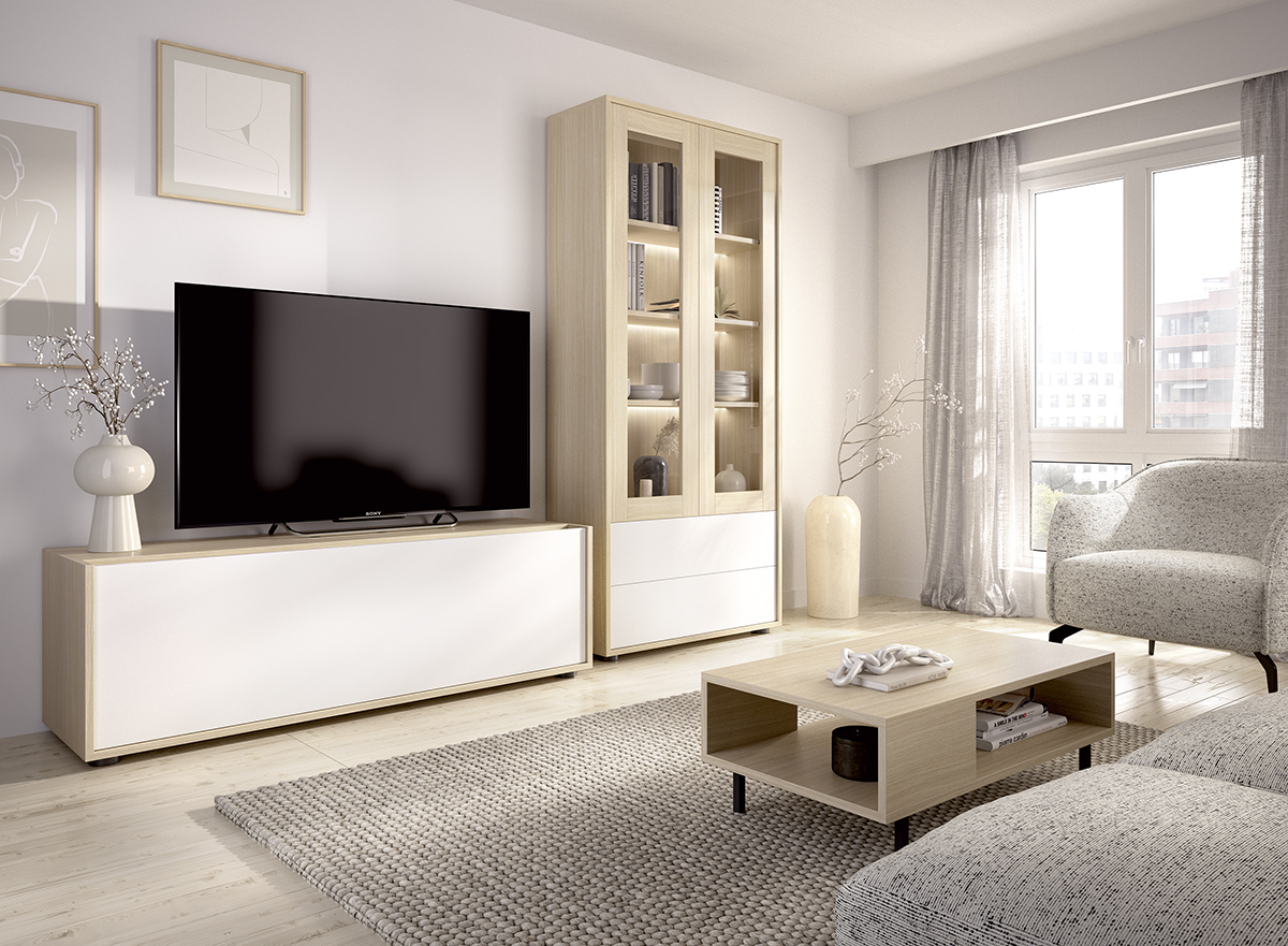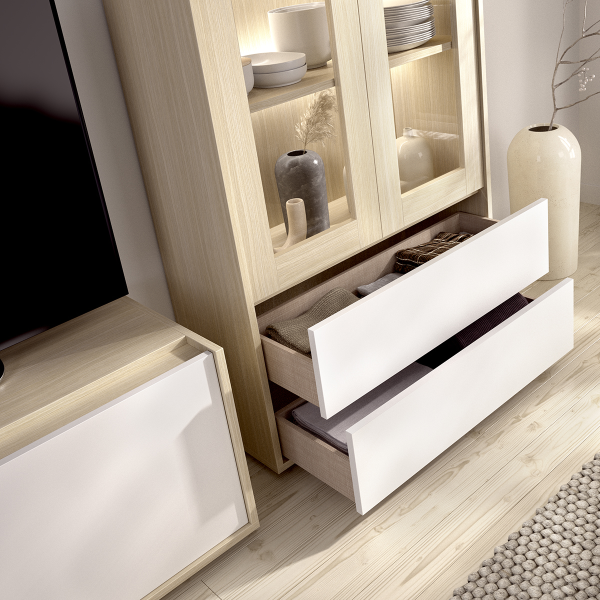 Comedor Moderno en roble y blanco de 232 cm compuesto por bajo 1 puerta abatible de 150 (f45) y vitrina 2 puertas cristal + 2 cajones de 82 (f35). Opcional kit 3 barras led de 78.Opcional kit 3 barras led para vitrina. Otras combinaciones de color según carta adjunta