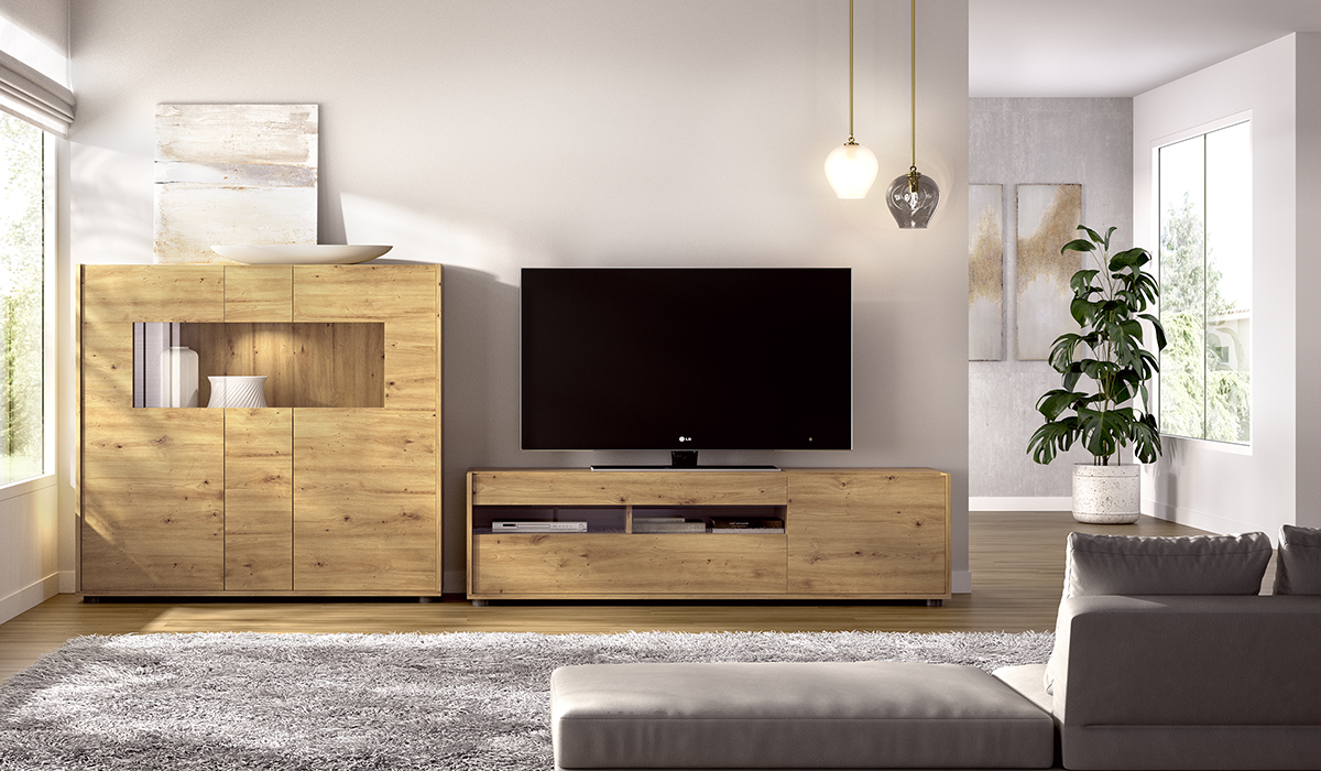 Comedor Moderno de 314 cm en color nordic formado por bajo puerta + cajón franja de 178 (fondo 45) y módulo singular 3 puertas cristal de 136 (fondo 35). Opcional kit 1 foco led. Otros colores según carta adjunta.