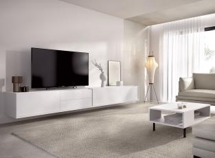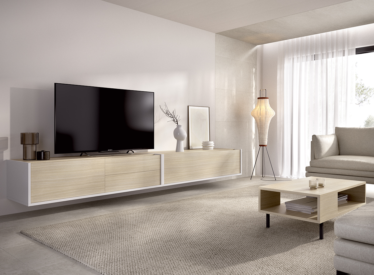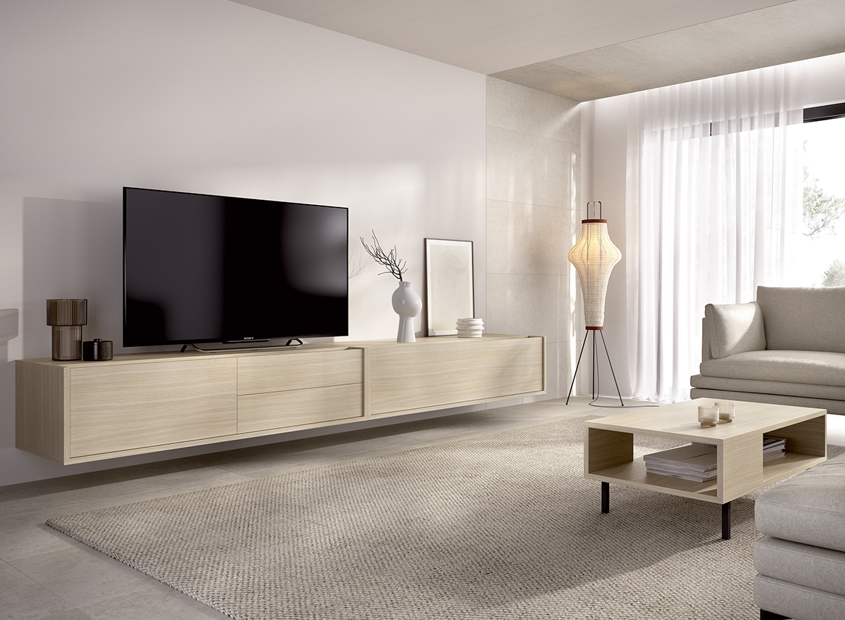 Comedor moderno de 300 cm en color roble. Compuesto por módulo colgado 1 puerta abatible de 150, módulo colgado 2 cajones + puerta abatible de 150 tirador push. Otros colores según carta adjunta