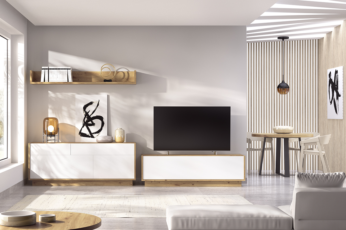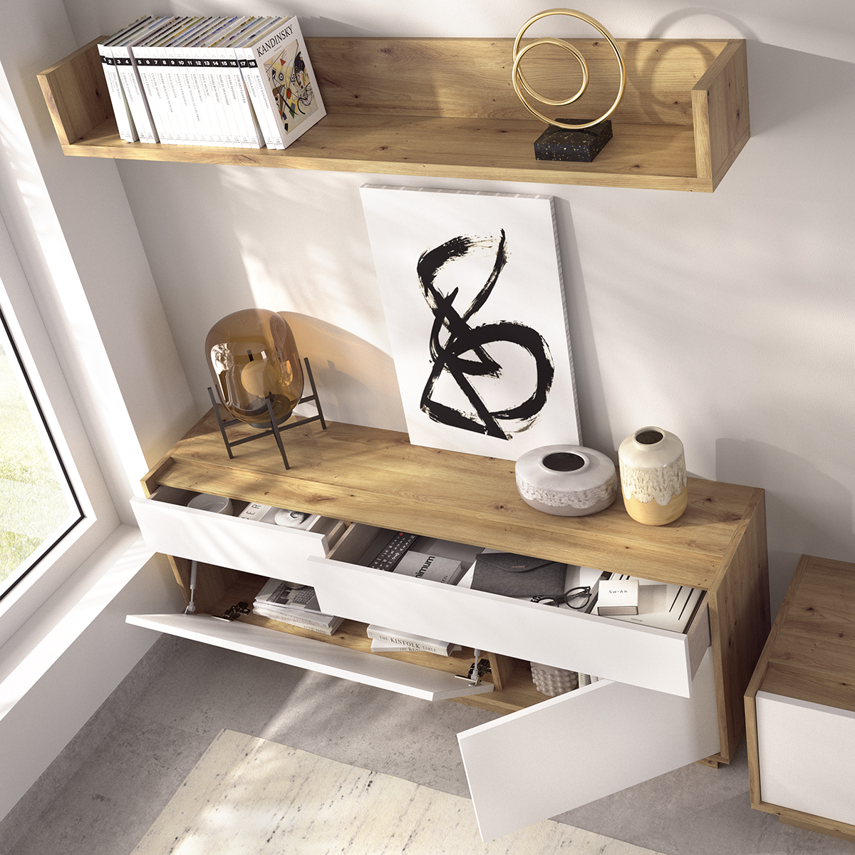 Comedor moderno de 300 cm en color nordic y blanco. Formado por bajo 2 cajones + puerta abatible + puerta de 150 con zócalo, bajo 1 puerta abatible de 150 con zócalo y estantería de 150. Otras medidas y colores disponibles