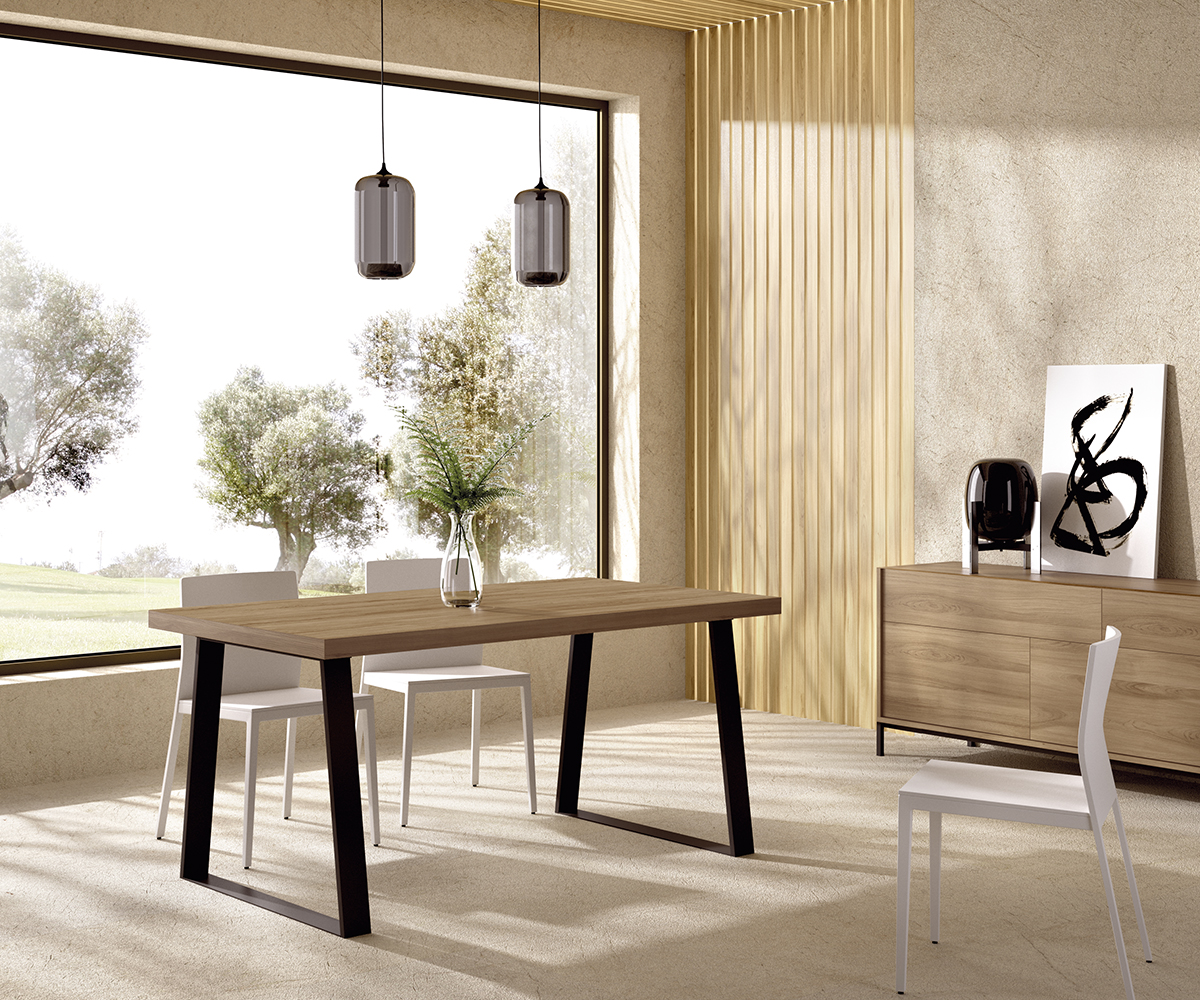 Mesa de comedor fija con patas metálicas grafito y sobre de 50 mm de grueso. Disponible de 120 x 90, 140 x 90 y 160 x 90. Otros colores según carta adjunta