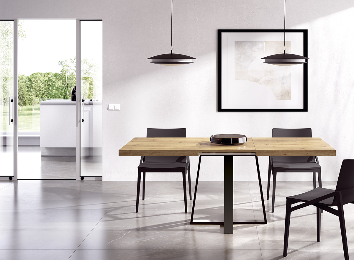 Mesa de comedor moderna extensible color nordic con pata metal grafito. Mesa de 120 x 90 extensible a 180 y mesa de 140 extensible a 200 cm. Colores disponibles según carta adjunta.