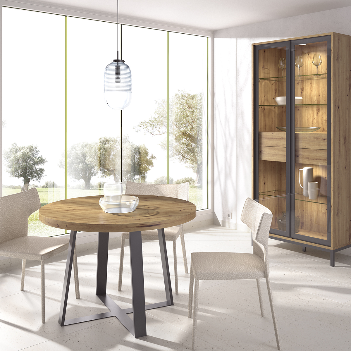 Mesa de comedor redonda fija con sobre de 50 mm de grueso y pata metal grafito. Disponible diámetro de 90, 110 y 120 cm. Colores disponibles según carta adjunta.